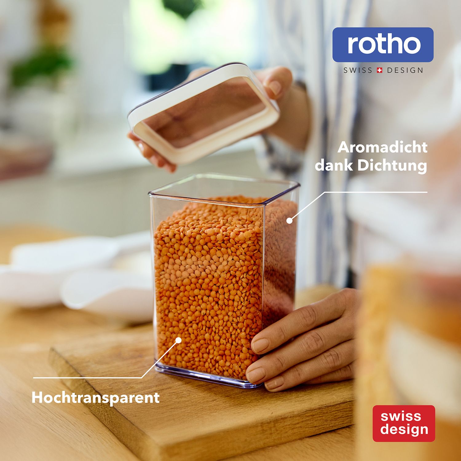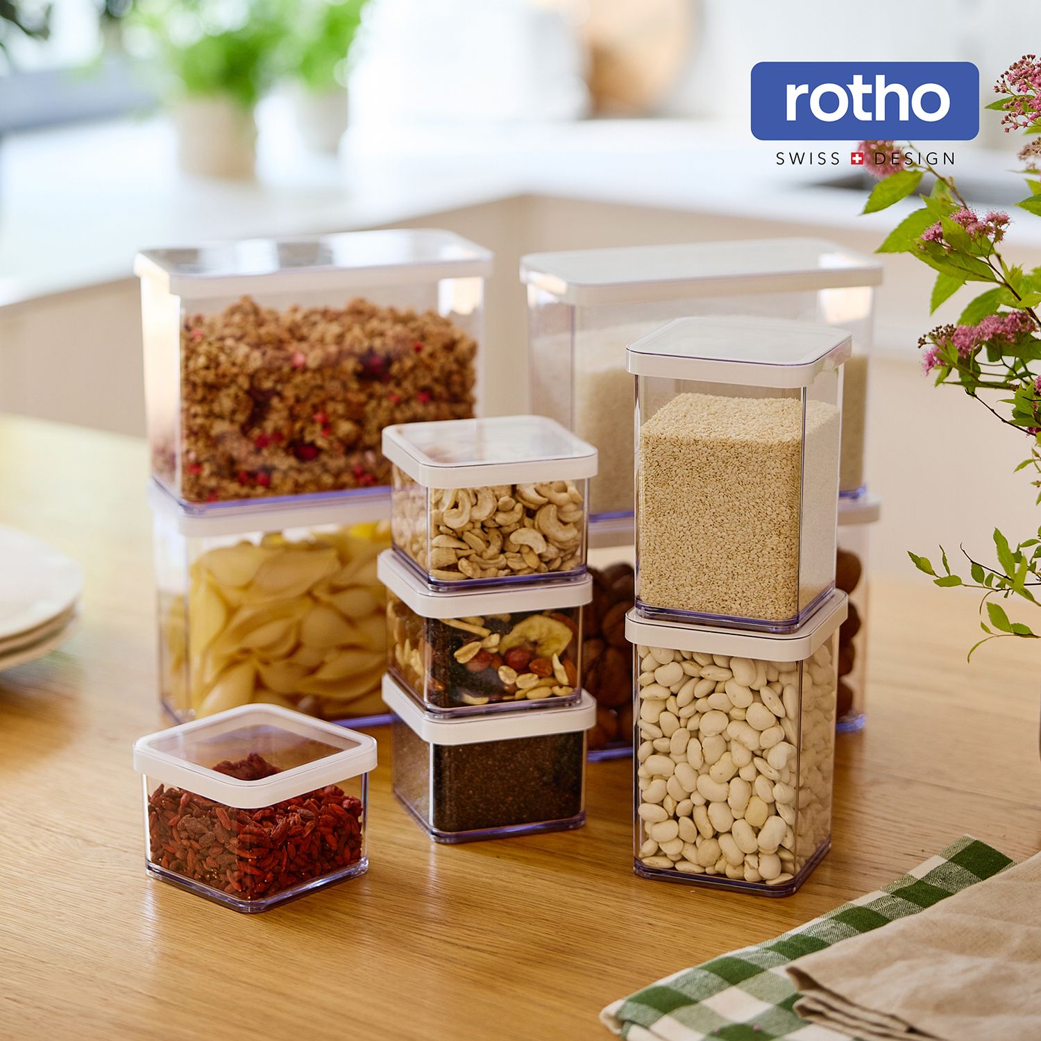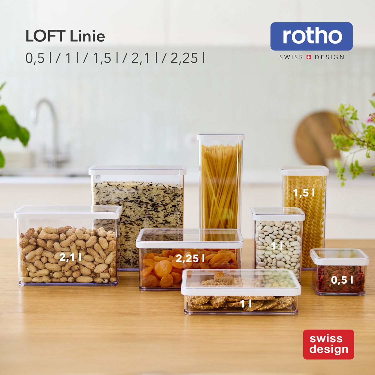 Con il set di contenitori per alimenti Rotho LOFT di alta qualità portate ordine, stile e freschezza nella vostra cucina. I contenitori ermetici e impilabili mantengono più a lungo freschi gli alimenti secchi come farina, riso o pasta e garantiscono una conservazione ordinata e igienica. In pensile, in cassetto o a vista su una mensola – con LOFT create un moderno sistema di organizzazione che unisce perfettamente funzionalità e design.