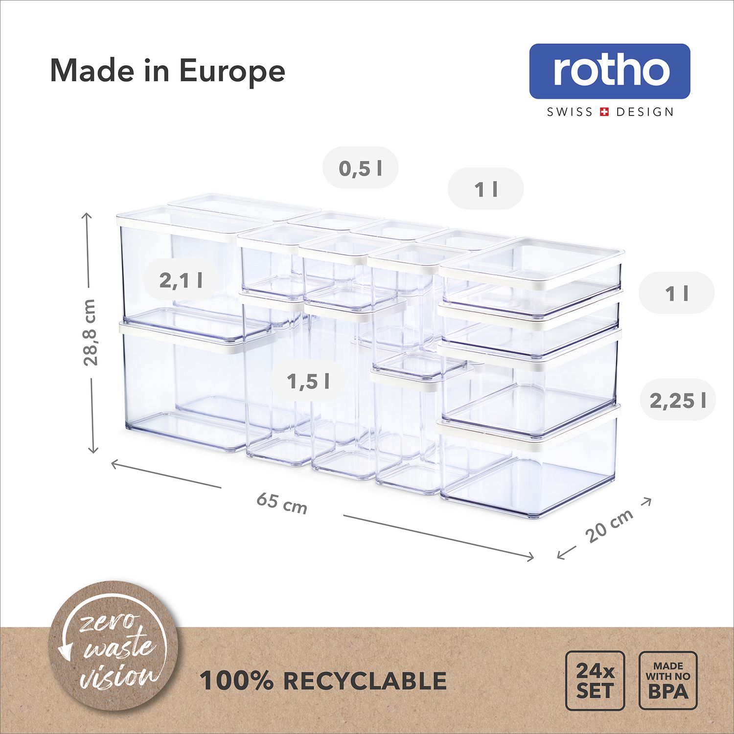 - Contenuto della confezione: set di 24 contenitori con 24x coperchi, 65×20×28,8 cm (L×P×A), base e coperchio trasparenti, anello di tenuta bianco - 8x 0,5 l, 2x 1,0 l (piatto), 5x 1,0 l, 3x 1,5 l, 4x 2,1 l, 2x 2,25 l